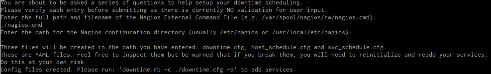 Once you've verified the services, all you need to do at that point is schedule a cronjob to run '/path/to/downtime.rb -c /path/to/config'. If you stored your config